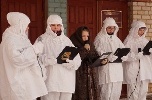 Несмотря на крепкий мороз на улице, все участники акции стояли и слушали девочек, говоривших о войне…